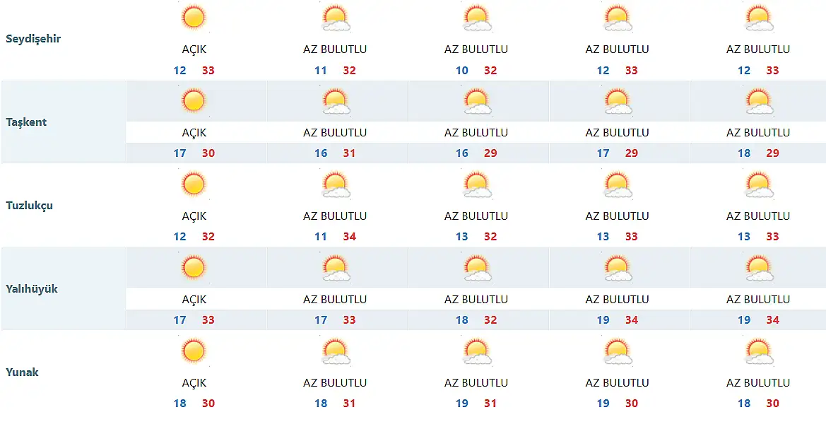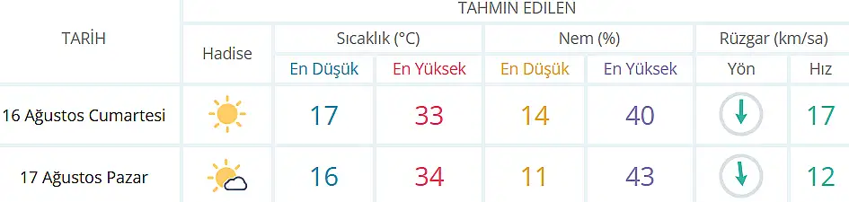İlçelerde ise pazar günü havanın az bulutlu geçeceği bildirildi. Hafta sonunu dışarıda geçirmek isteyenlerin sıcak hava ve güneşli gökyüzünü fırsat bilmesi bekleniyor.