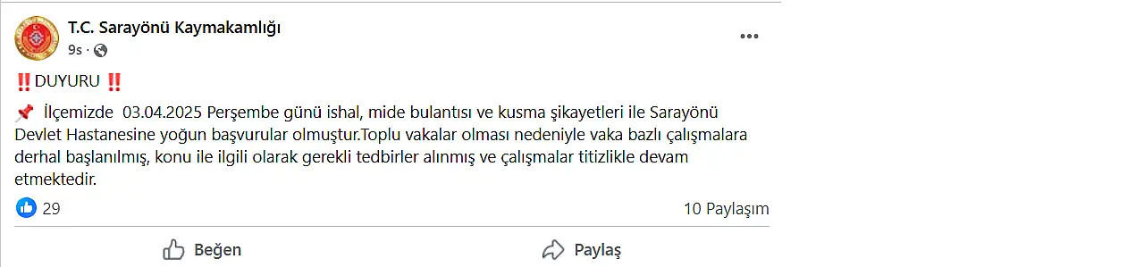 "İlçemizde 03.04.2025 Perşembe günü ishal, mide bulantısı ve kusma şikayetleri ile Sarayönü Devlet Hastanesine yoğun başvurular olmuştur. Toplu vakalar olması nedeniyle vaka bazlı çalışmalara derhal başlanılmış, konu ile ilgili olarak gerekli tedbirler alınmış ve çalışmalar titizlikle devam etmektedir." sözlerine yer verdi.