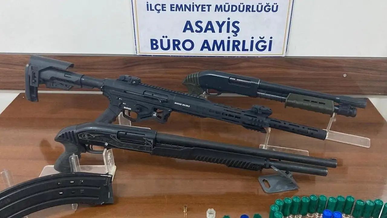 3 şüpheli ile birlikte bir tabanca, tabanca şarjörü, tabanca mermisi, kurusıkı tabanca mermisi, 3 av tüfeği, tüfek şarjörü ve çok sayıda av tüfeği fişeği de ele geçirildi.