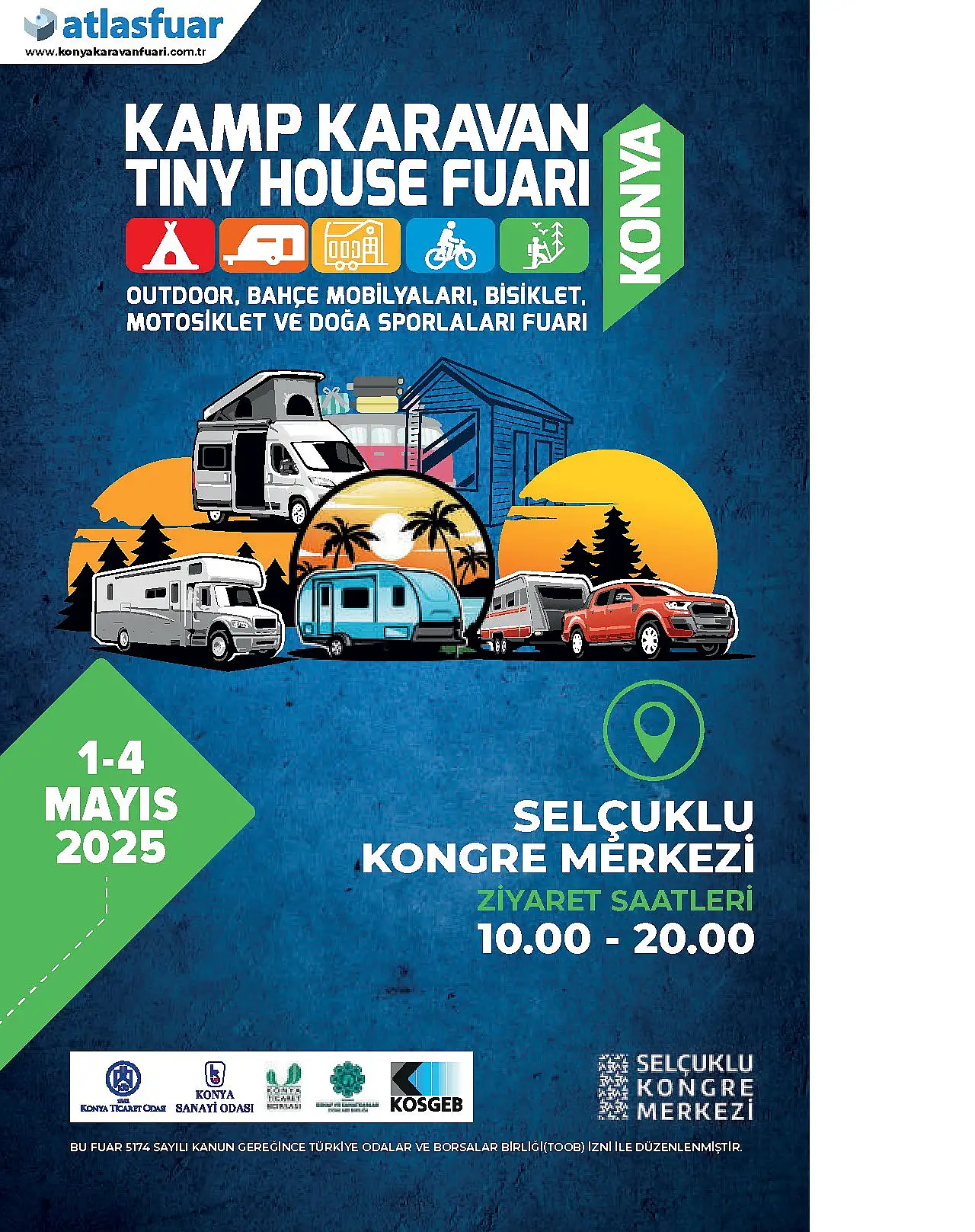 Konya'da ilki gerçekleşecek olan 'Kamp Karavan Tiny House Fuarı' birçok outdoor, bahçe mobilyaları, bisiklet, motosiklet ve doğa sporları ürünleri ile 1-4 Mayıs 2025 tarihlerinde SKM'de doğa ve karavan tutkunlarıyla buluşacak.1-4 Mayıs 2025 tarihleri aras
