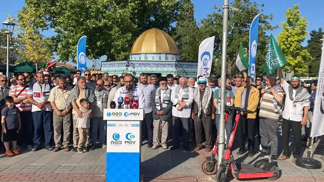 Kültür Park'ta toplanan AGD üyeleri ve vatandaşlar, İsrail aleyhine sloganlar atarak, Refah kentinde yerinden edilen Filistinlilerin yaşadığı kampa düzenlenen saldırıya tepki gösterdi.Alanda önce Kur'an-ı Kerim okundu, ardından dua edildi.
