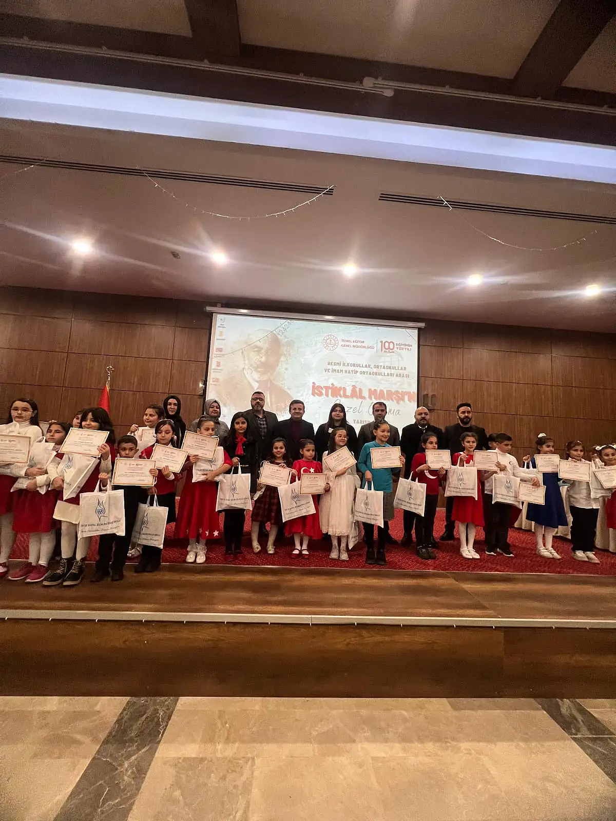 İstiklâl Marşı'nın Kabulü ve Mehmet Akif Ersoy'u Anma Günü etkinlikleri çerçevesinde öğrencilerin İstiklâl Marşı'nın derin anlamını ve Milli Mücadele’nin tarihsel önemini kavramaları, geçmiş ile gelecek arasında millî, manevi ve tarihi bir köprü kurabilmeleri; vatan, millet, bayrak sevgisi ve bu değerlere karşı duyarlılık geliştirmeleri amacıyla Temel Eğitim Genel Müdürlüğüne bağlı resmî ilkokul, ortaokul ve imam hatip ortaokulu öğrencileri arasında İstiklâl Marşı'nı Güzel Okuma yarışması yapıldı.