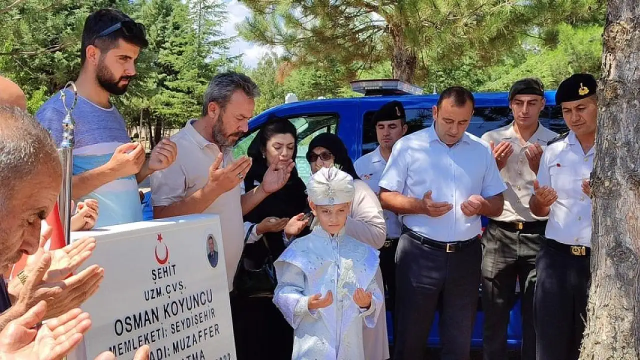 Çocuk için süslenen İlçe Jandarma Komutanlığının görev aracı, sünnet arabası olarak tahsis edildi.Konvoyla şehidin defnedildiği Akyol Mezarlığı'na giden Kaan, babasının mezarı başında dua etti.