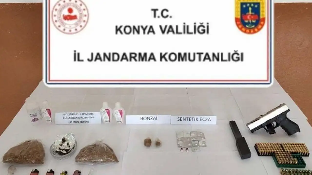 Karatay ilçesinde ise, Konya İl Jandarma Komutanlığı KOM Şube Müdürlüğü ve Karatay İlçe Jandarma Komutanlığı ekiplerince yapılan istihbari çalışmalar sonucunda, uyuşturucu madde imal ve ticareti yaptığı istihbari bilgisinin alınması üzerine 2 şahsın ikamet ettiği ev ve eklentilerinde arama yapıldı. Arama sonucunda, 13 gram bonzai maddesi, 12 adet sentetik ecza, 1 adet kurusıkı tabanca, 2 adet şarjör, 32 adet 9 mm çapında tabanca fişeği, 154 adet 9 mm çapında kurusıkı tabanca fişeği, uyuşturucu yapımında kullanılan 150 gram tütün, 4 adet çakmak, 4 adet aseton, 2 adet uyuşturucu kullanma aparatı (payp) ele geçirildi. Bahse konu malzemelere el konularak olay ile ilgili tahkikata başlanırken, ifadeleri alınan 2 şüpheli serbest kaldı.