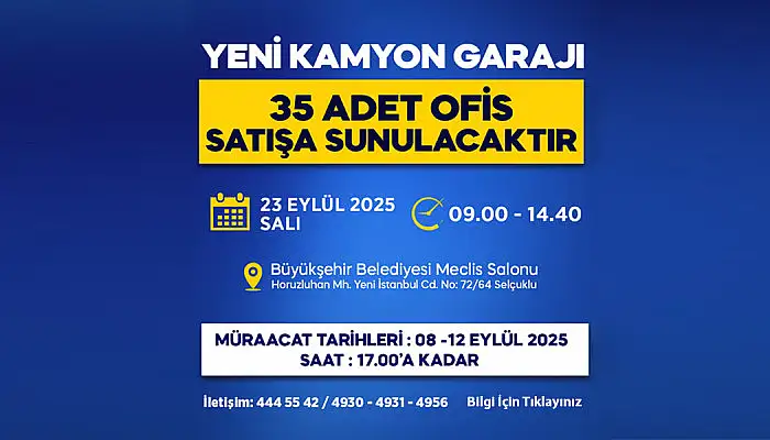 Konya Büyükşehir Belediyesi yeni kamyon garajında bulunan 35 adet ofisi ihaleyle satışa çıkarıyor. İhaleye katılmak isteyenler için ofislerin satışı 23 Eylül 2025 Salı günü 09.00 ile 14.40 saatleri arasında yapılacak.
