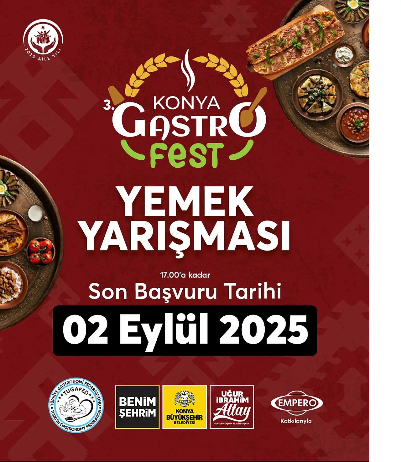Konya, gastronomi tutkunlarını ağırlamak için üçüncü kez büyük bir lezzet şölenine hazırlanıyor. Bu yıl gastronomi tutkunlarını bir araya getirecek olan festivalde yapılacak olan yemek yarışması da kendi tarifini sergilemek isteyen gastronomi meraklıları için damaklarda iz bırakma ve öne çıkma anlamında eşsiz bir fırsat sunuyor. Yemek yarışması için başvuru süreci 2 Eylül saat 17.00'ye kadar devam edecek.