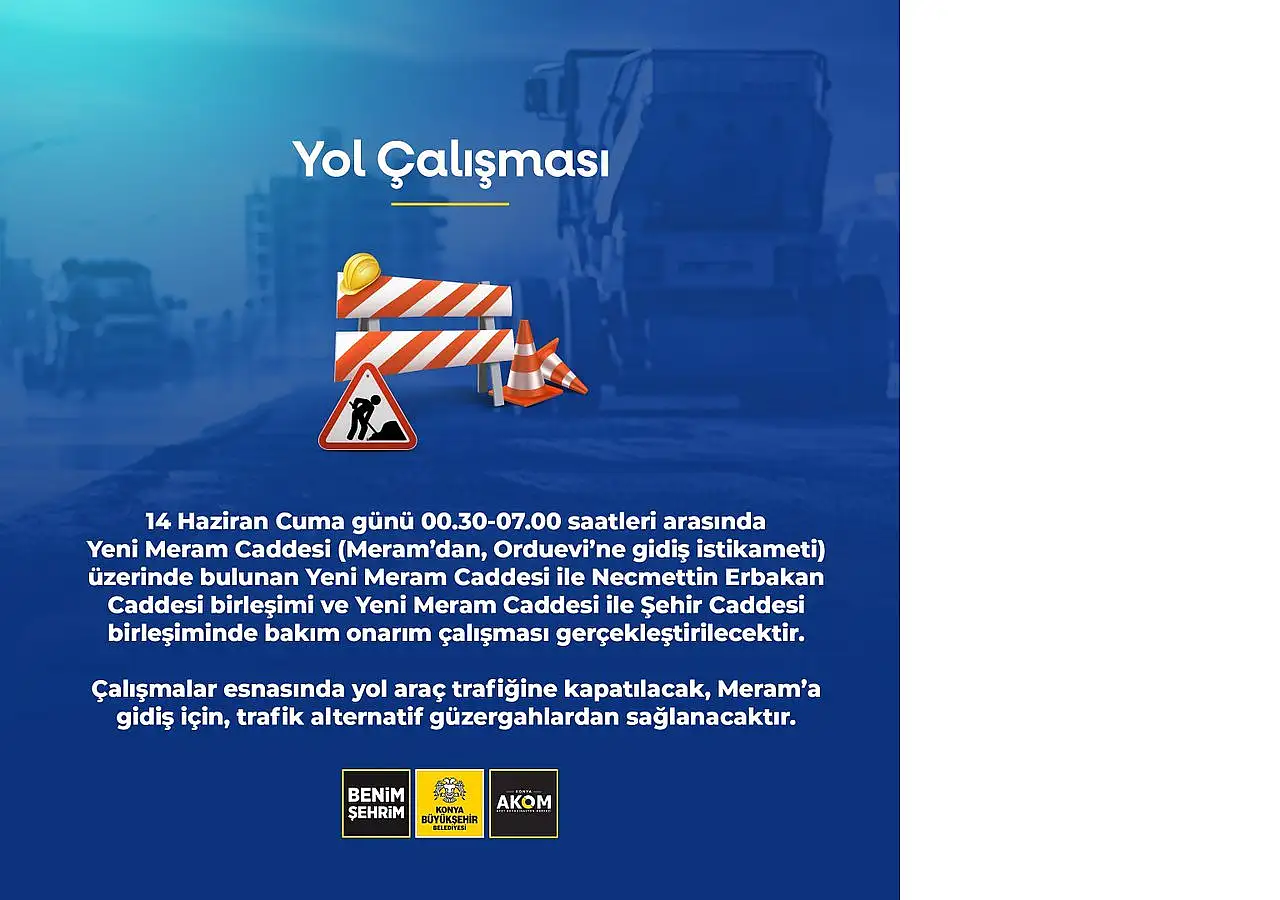 "Yol Yapım Çalışması Hakkında Bilgilendirme 14 Haziran Cuma günü 00.30-07.00 saatleri arasında Yeni Meram Caddesi (Meram'dan, Orduevi'ne gidiş istikameti) üzerinde bulunan Yeni Meram Caddesi ile Necmettin Erbakan Caddesi birleşimi ve Yeni Meram Caddesi ile Şehir Caddesi kombinasyonunda bakım çalışması gerçekleştirilecektir. . Çalışmalar sırasında araç trafiğe kapatılacak, Meram'a gidiş için, trafik alternatif güzergahlardan ayrılacak."