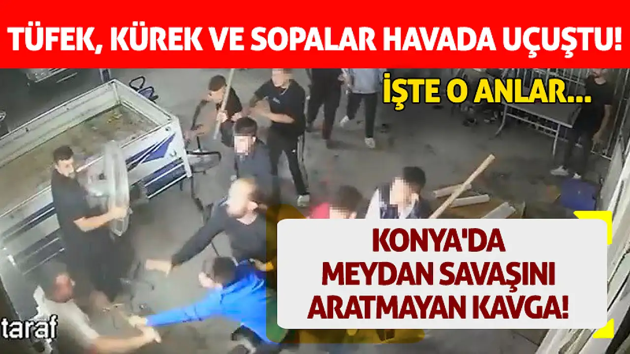 Konya'da bir iş yerine gelen çoğu çocuk yaştakilerden oluşan grubun, iş yeri sahibi iki kardeş ile sopa, kürek ve tüfekle meydan savaşını andıran kavga anı güvenlik kamerasına yansıdı.Olay, geçtiğimiz 14 Eylül Pazar günü akşam saatlerinde merkez Selçuklu