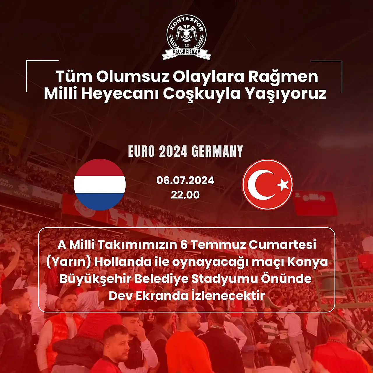 Nalçacılılar sosyal medya hesabından yaptığı açıklamayla A Milli Takımımızın Hollanda ile oynayacağı maçı Konya Büyükşehir Belediye Stadyumu önünde dev ekranda izleneceğini paylaştı.