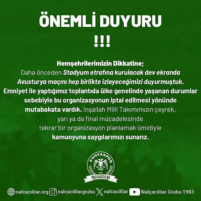 Nalçacılılar'ın düzenlediği A Milli Takımın Avusturya ile oynayacağı maç bugün saat 22:00'da Medaş Konya Büyükşehir Stadyumu Kuzey Doğu otopark önünde dev ekranda izlenecekti ancak emniyet güçleriyle yapılan toplantıda güvenlik nedeniyle organizasyonun ip