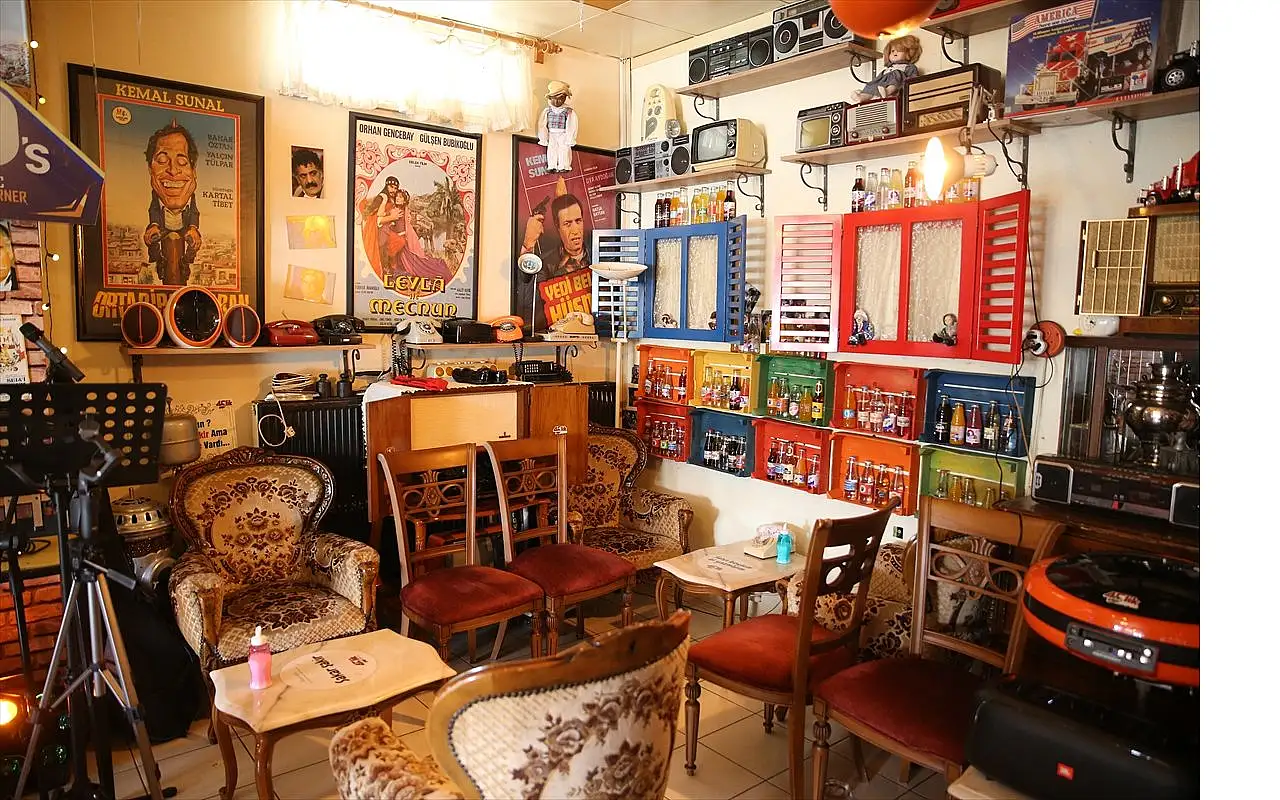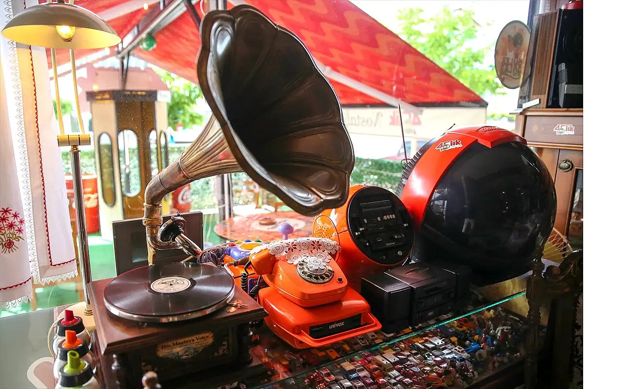 Kafe olarak da hizmet veren yer, rengarenk tüplü televizyonlar, gramofonlar, taş plaklar, taş bebekler, radyolar, gaz lambaları, dantel örtüler, eski bakkal ürünleri, nostaljik gazozlar, güğüm, el gırgırı, çiçek motifli perdelerle gelenleri yıllar öncesine götürüyor.