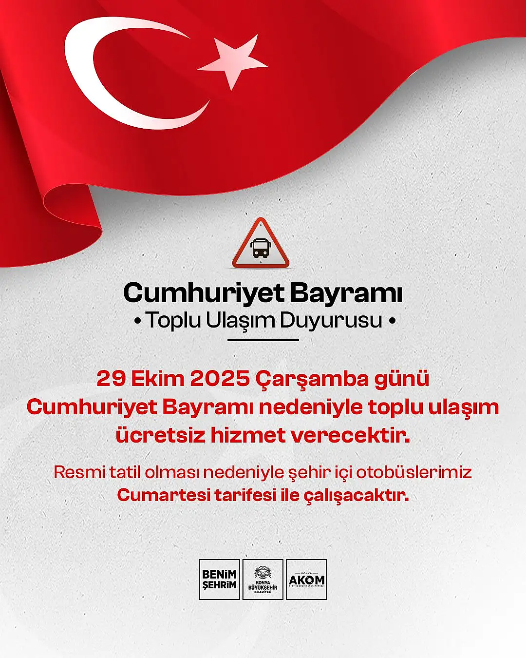Konya Büyükşehir Belediyesi, 29 Ekim Cumhuriyet Bayramı'nda vatandaşlara toplu taşıma kolaylığı sağlayacak.Konya Afet Koordinasyon Merkezi (AKOM) tarafından yapılan paylaşıma göre, 29 Ekim 2025 Çarşamba günü şehir içi toplu ulaşım ücretsiz olacak.