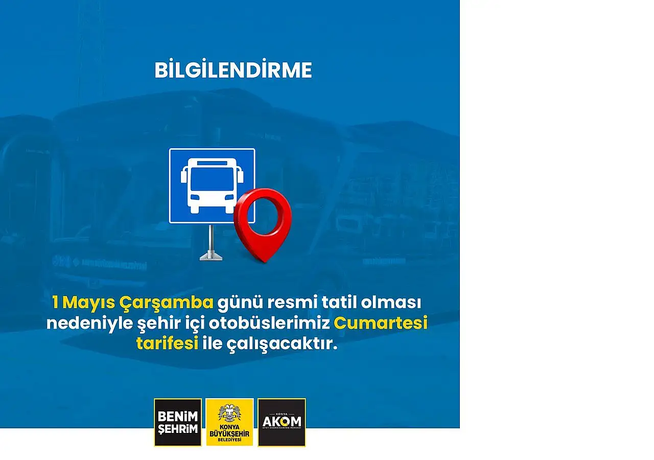 Konya Büyükşehir Belediyesi Afet Koordinasyon Merkezi sosyal medya hesabından yaptığı paylaşımla Konya'da yarın 1 Mayıs İşçi Bayramı olması sebebiyle şehir içi otobüslerinde cumartesi tarifesi uygulanacak.AKOM yaptığı paylaşımda şu sözlere yer verdi 'Bil