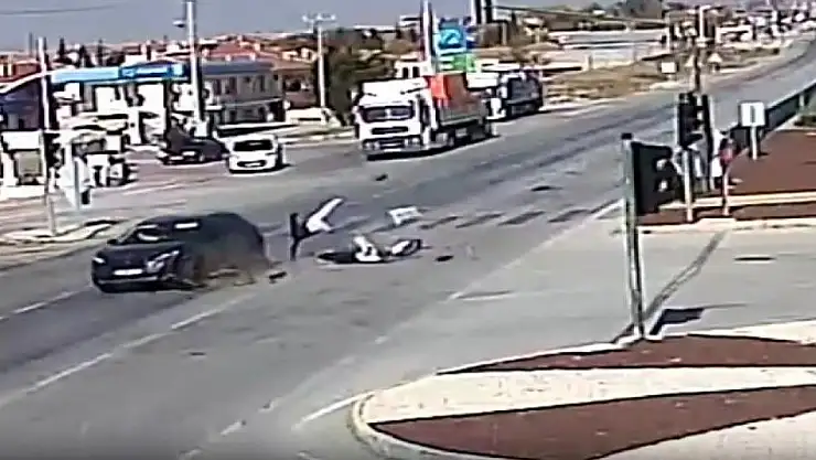 Kaza anı ise güvenlik kamerasına yansıdı. Görüntülerde kavşağa gelen motosikletin durakladığı, ardından hareket ederek yoldan gelen otomobil ile çarpışması ve sürücünün savrularak yere düştüğü görülüyor. Kaza ile ilgili tahkikat devam ediyor.