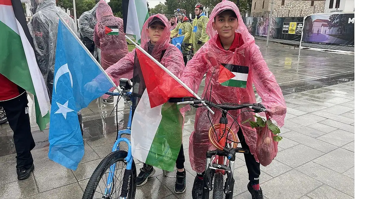 Kılıçarslan Meydanı'nda toplanan kalabalık, yağmur altında bisikletlerine Filistin bayrakları astı.