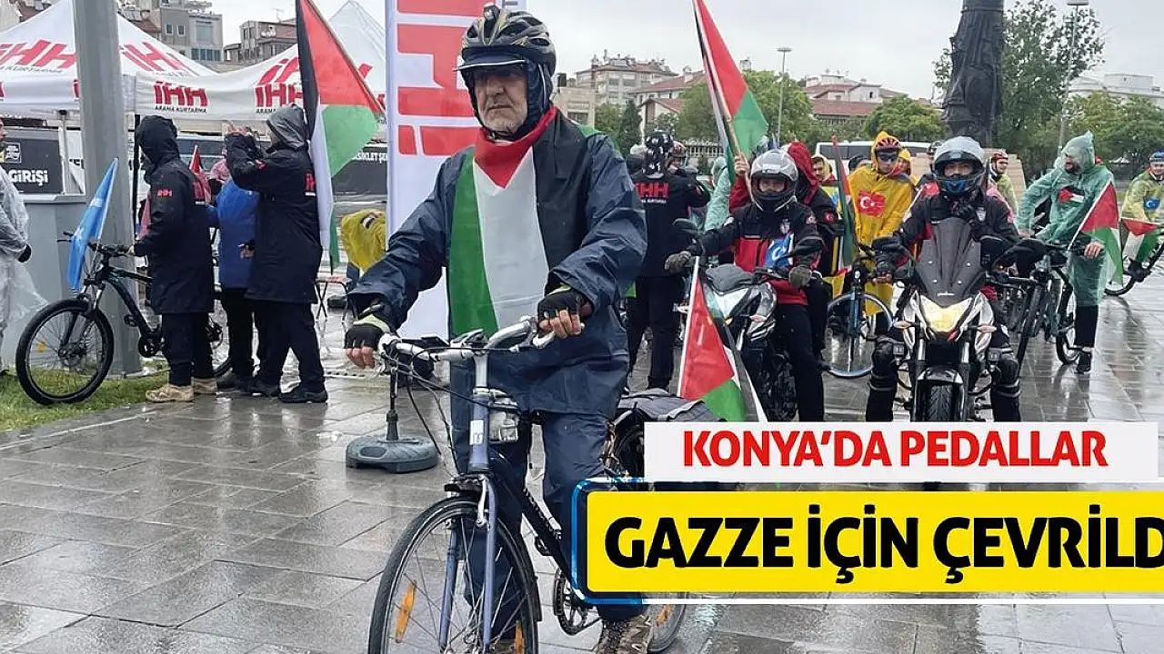 Kılıçarslan Meydanı'nda toplanan kalabalık, yağmur altında bisikletlerine Filistin bayrakları astı.İHH İnsani Yardım Vakfı Konya Şube Başkanı Hasan Hüseyin Uysal, burada gazetecilere yaptığı açıklamada, Orta Doğu'da 1917'den beri ateş, kan ve barutun hiç