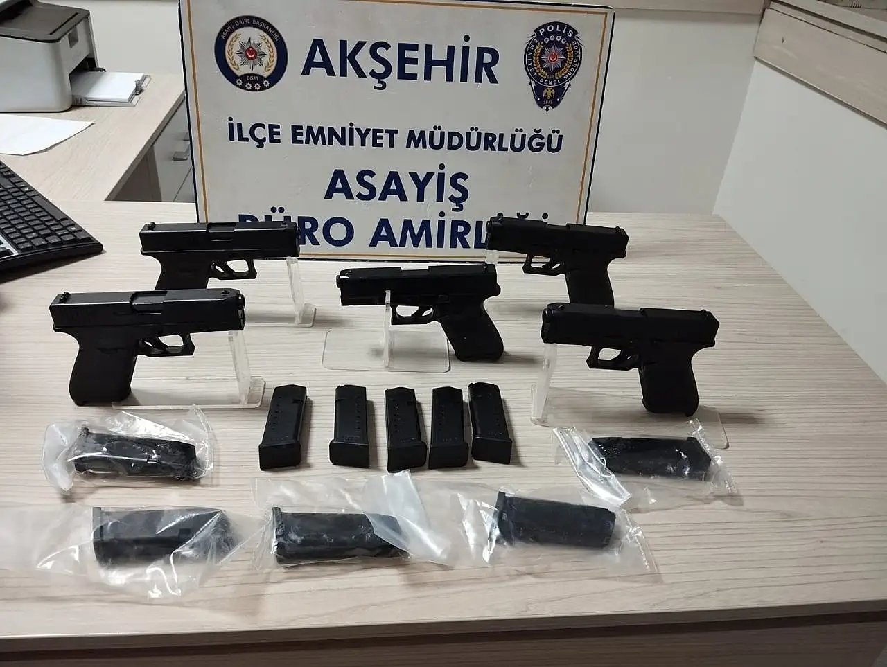 Edinilen bilgiye göre, Akşehir İlçe Emniyet Müdürlüğüne bağlı ekiplerin yaptığı istihbarı çalışmalar çerçevesinde silah kaçakçılarının bir araç ile silah taşıdığı belirlendi. Ekipler plakasını tespit ettiği aracı takibe alarak D-300 uygulama noktasında durdurdu. Araçta bulunan şüpheliler R.A. ile A.Ö.'yü gözaltına alan ekipler, şahısların üzerinde ve araçta yaptığı aramada 5 adet ruhsatsız tabanca ile 10 adet tabanca şarjörü ele geçirdi.