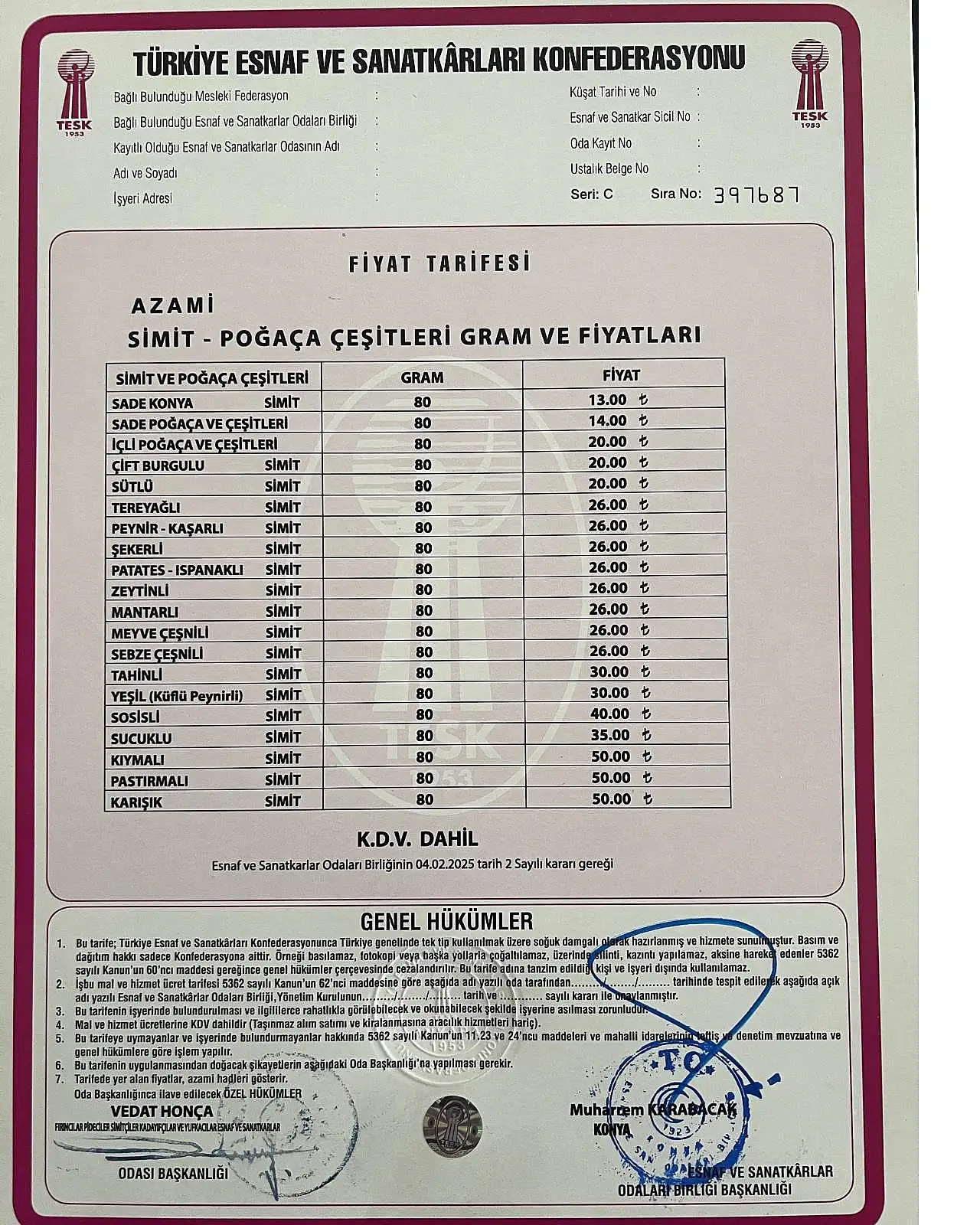 Konya Fırıncılar Odası Başkanı Vedat Honça, 'Simitte girdi maliyetlerinin artması sebebiyle Simitte fiyat yeniden güncellenmiştir Yeniden güncellenen fiyatlar liste ve gramajları listede belirtilmiştir.Uygulamaya 12 Şubat 2025 tarihinde Çarşamba günü itib