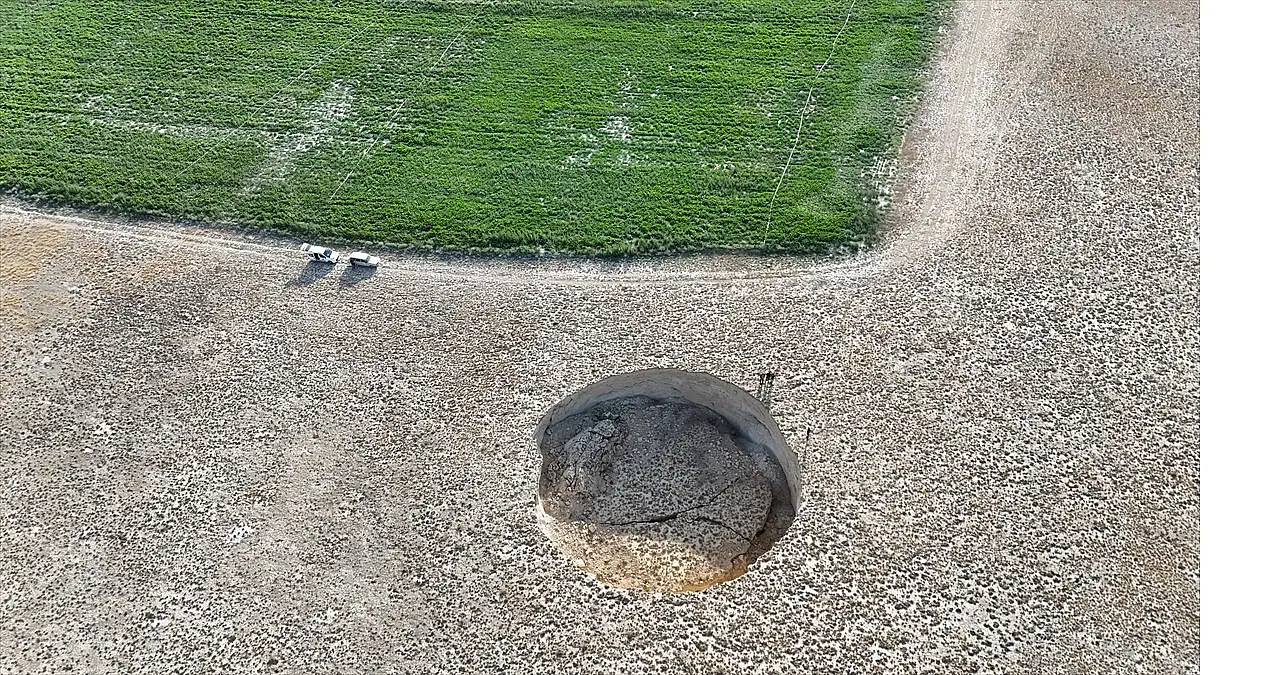 "Dün gece saat 02.30'da bir ses duydum. Sabah pancar tarlasına geldiğimde büyük bir çöküntü gördüm. Abimi aradım, durumu anlattım ve fotoğraf çektim. Çok korktuk, gece vana çevirmeye gelmiştim. Buradan motosikletle bile geçmeye korkuyorum. O ses uçak sesi gibiydi, meğer burası çökmüş."