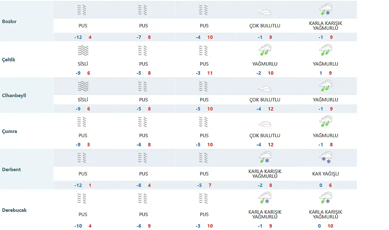 Konya'nın en soğuk ilçelerini sırasıyla -12 derece ile Derbent ve Bozkır ilçeleri takip ediyor.