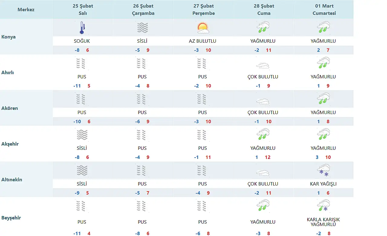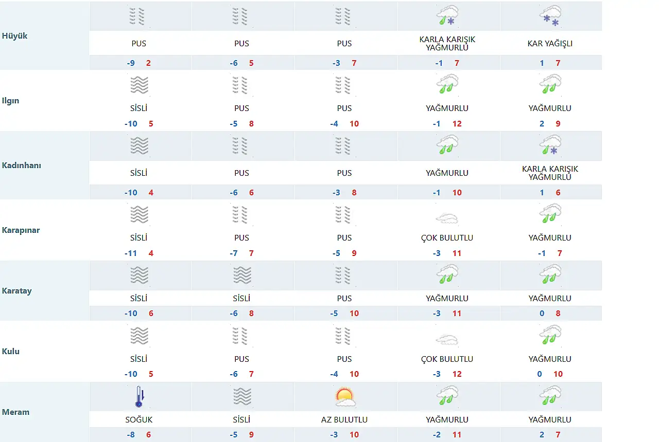KONYA VE İLÇELERİNDE EN DÜŞÜK VE EN YÜKSEK SICAKLIK DERECELERİ İSE ŞU ŞEKİLDE;