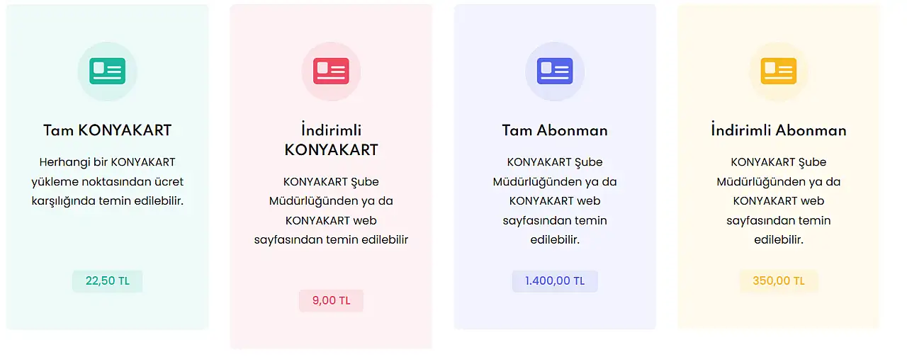 Yapılan güncellemeye göre, KonyaKart biniş ücretinin 17.5 TL'den 22,5 TL'ye, indirimli KonyaKart biniş ücretinin ise 6.75'TL'den 9 TL'ye yükseldi. Bunların yanı sıra tam abonman KonyaKart’ın bin 150TL'den bin 400 TL'ye, indirimli abonmanın KonyaKart’ın ise 290TL'den 350 TL'ye yükseldi.