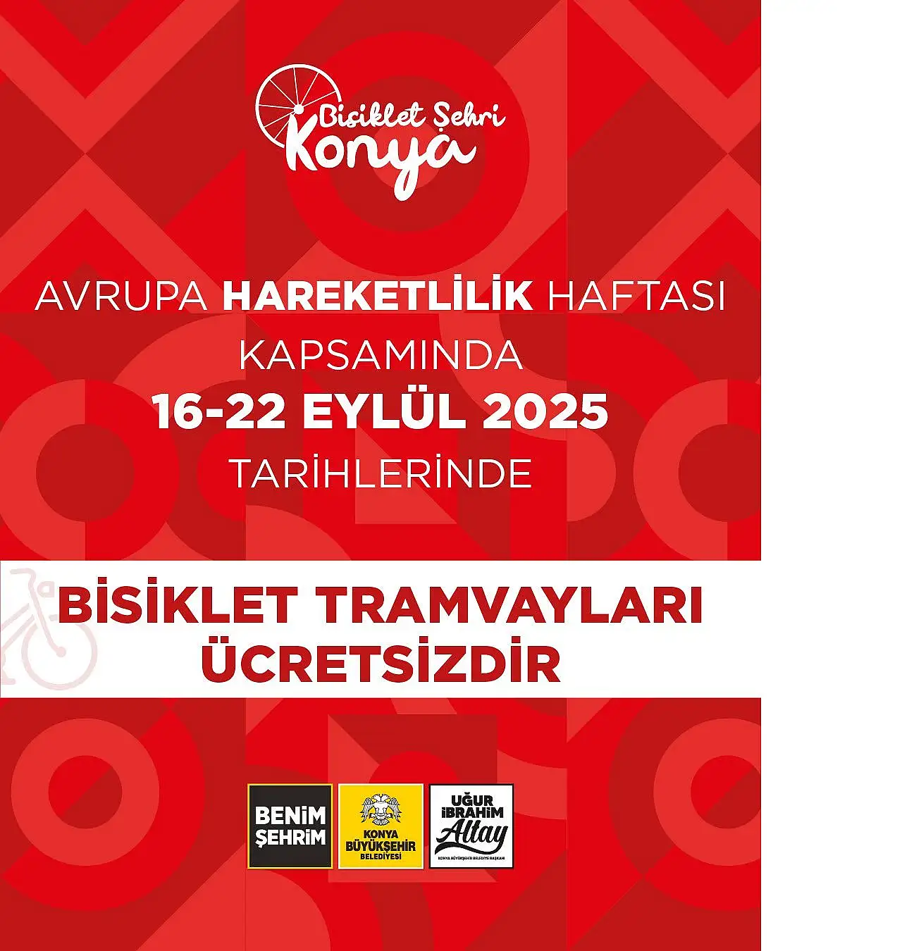Konya'da toplu ulaşımın bel kemiği olan tramvaylar bir hafta boyunca ücretsiz olacak. Konya Büyükşehir Belediyesi Afet Koordinasyon Merkezi sosyal medya hesabından yaptığı paylaşımla, Avrupa Hareketlilik Haftası kapsamında 16-22 Eylül tarihleri arasında Bisiklet Tramvayı, bisiklet ile yolculuk yapan Konyalılara ücretsiz bir şekilde hizmet verecek.