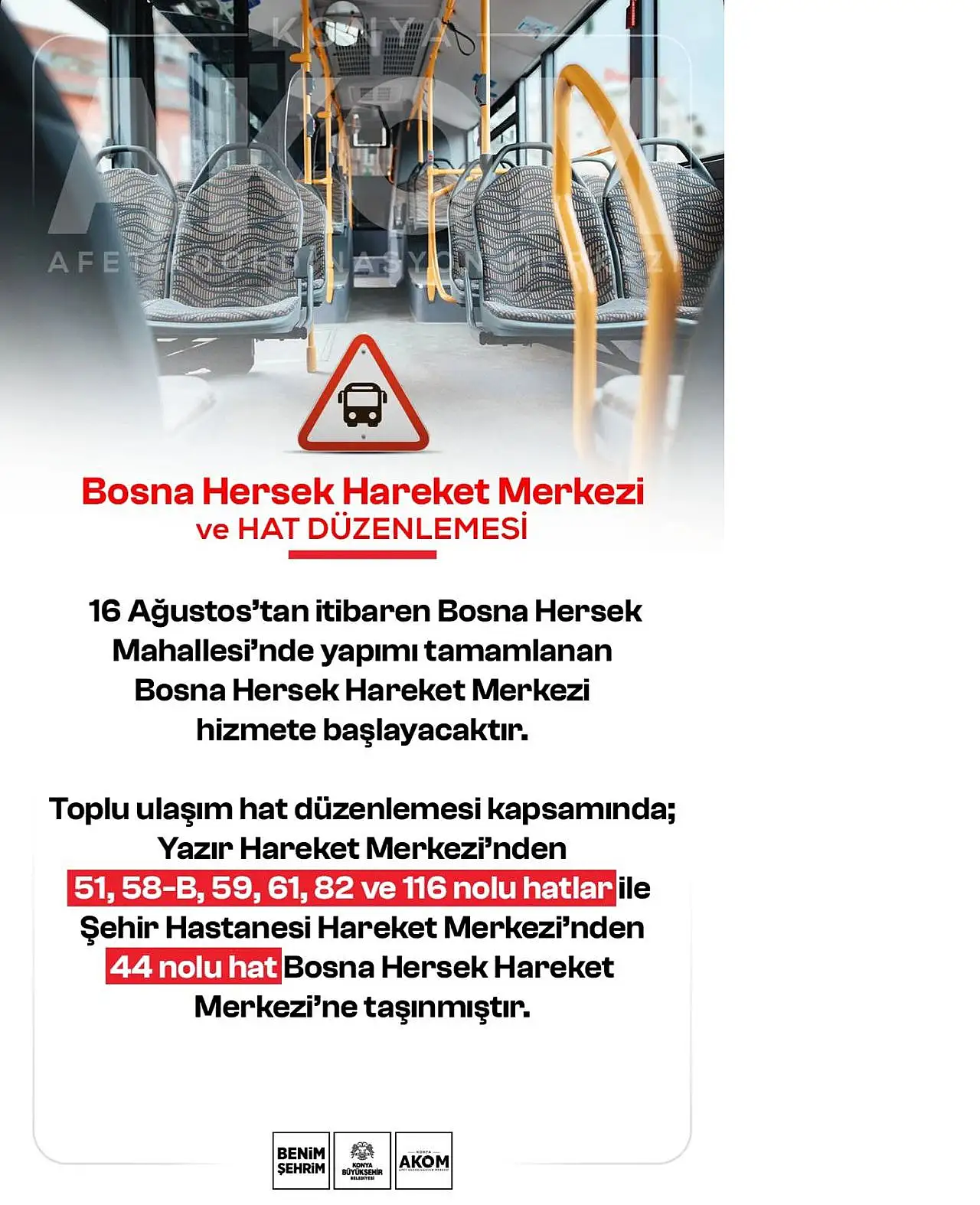 Konya'da toplu ulaşıma yönelik önemli bir adım atıldı. Konya Büyükşehir Belediyesi Afet Koordinasyon Merkezi (AKOM) Bosna Hersek Mahallesi'nde yapımı tamamlanan yeni hareket merkezinin hizmete gireceğini duyurdu. Bu düzenlemeyle birlikte bazı otobüs hatlarının güzergahlarında da değişiklikler yapıldı.