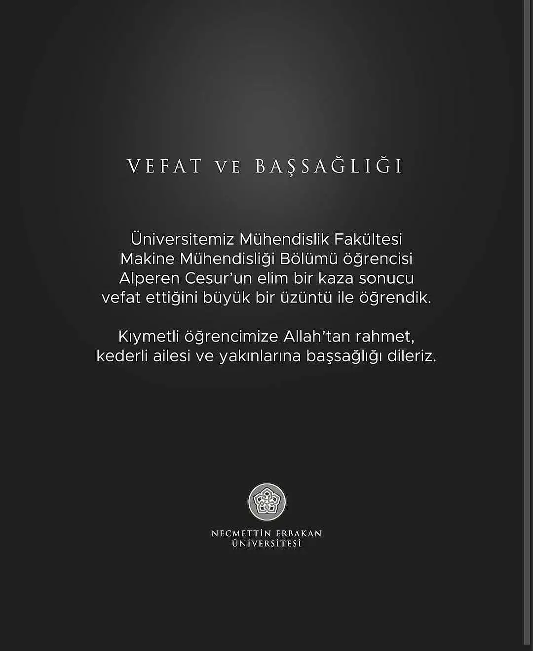 "Üniversitemiz Mühendislik Fakültesi Makine Mühendisliği Bölümü öğrencisi Alperen Cesur’un elim bir kaza sonucu vefat ettiğini büyük bir üzüntü ile öğrendik. Kıymetli öğrencimize Allah’tan rahmet, kederli ailesi ve yakınlarına başsağlığı dileriz."