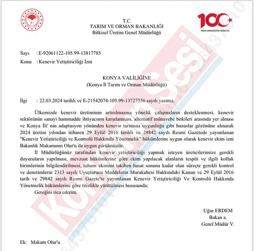 Konya İl Tarım ve Orman Müdürlüğü, kenevir yetiştiriciliğinde Konya’nın Resmi Gazete'de yayımlanan “Kenevir Yetiştiriciliği Ve Kontrolü Hakkında Yönetmelik” hükümlerine uygun olduğu gerekçesiyle Tarım ve Orman Bakanlığı’ndan izin aldığını duyurdu.