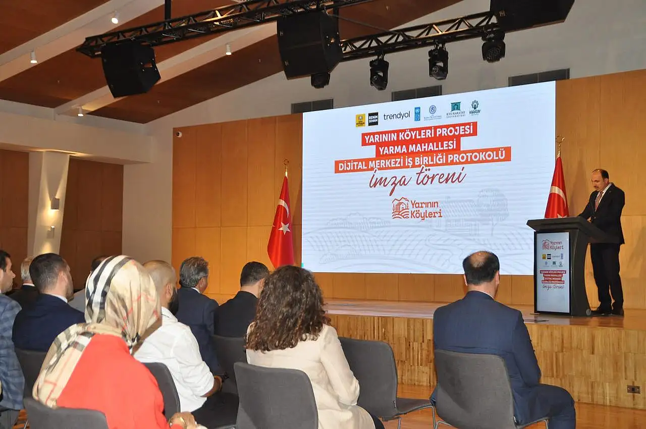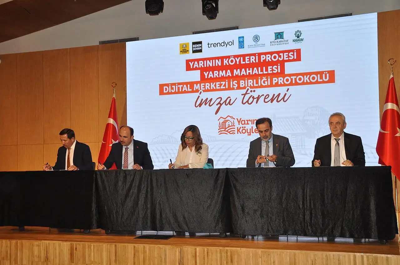 İmza törenine Konya Büyükşehir Belediye Başkanı Uğur İbrahim Altay, Karatay Belediye Başkanı Hasan Kılca, Konya Ticaret Odası Başkanı Selçuk Öztürk, KTO Karatay Üniversitesi Rektörü Prof. Dr. Fevzi Rifat Ortaç, Konya İl Tüketici Hakem Heyeti Başkanı Mustafa Çağlayan ve Birleşmiş Milletler Kalkınma Programı (UNDP) Türkiye Mukim Temsilcisi Monica Merino Domínguez katıldı. Eşitlik, kapsayıcılık ve çeşitlilik ilkelerinden ilham alan Yarının Köyleri projesi, çocukların, gençlerin, kadınların ve engelli bireylerin karşı karşıya kaldığı dijital fırsat eşitsizliğini ortadan kaldırmayı ve köy ile şehir arasındaki teknoloji ve teknolojinin sunduğu fırsatlara erişimdeki uçurumun kapatılmasını amaçlıyor. Ayrıca proje ile yerelde istihdamın artırılması, üretimin güçlendirilmesi, kültürel değerlerin korunarak kırsal kalkınmanın desteklenmesi hedefleniyor. Köylerdeki üreticileri e-ticaret ile tanıştıran Yarının Köyleri, kırsal yerleşimlerin dijitalleşme düzeylerini artırarak yeni fırsatlar ortaya koyuyor. Üreticiler bu dijital merkezlerde, ürün geliştirme ve çeşitlendirme, markalaşma, logo tasarım, katma değerli ürün geliştirme, e-ticaret, dijital pazarlama konularında bilgi ve deneyim kazanırken, çeşitli eğitimler ile dijital yetkinliklerini güçlendiriyor.