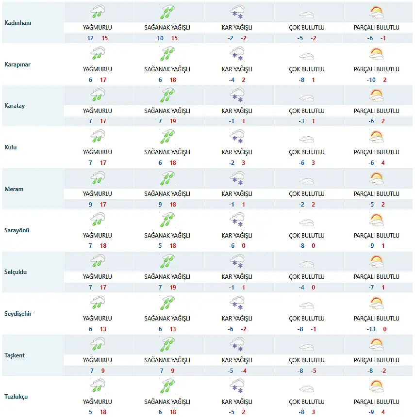 Konya'nın merkez ve ilçelerinde en düşük ve en yüksek sıcaklık dereceleri ise şu şekilde;