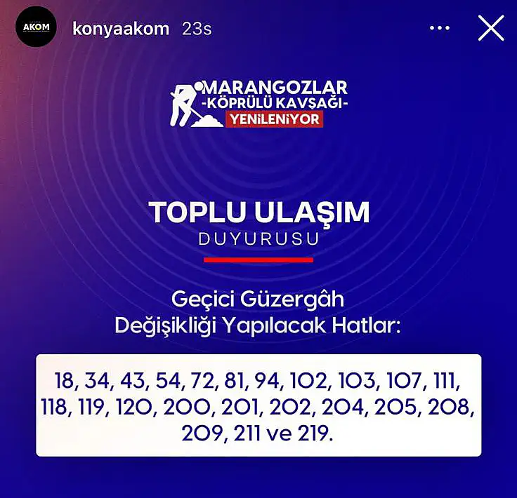 Konya Büyükşehir Belediyesi'ne bağlı Afet Koordinasyon Merkezi’nin(AKOM) duyurusuna göre Marangozlar Köprülü Kavşağı'nda başlayacak olan yenileme çalışmaları kapsamında bazı otobüs hatlarının güzergahlarında geçici düzenlemeye gidildi.