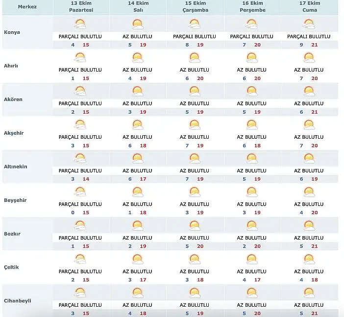 Hava durumu raporlarına göre Konya genelinde parçalı ve az bulutlu bir hava etkili olacak. 13 Ekim Pazartesi günü (bugün) gündüz sıcaklığının 11 derece civarında, gece ise sıfır dereceye kadar düşmesi tahmin ediliyor.