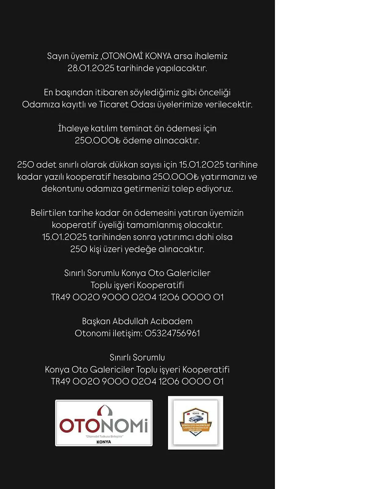 Öncelik Konya Oto Galericiler Odasına kayıtlı üyelere ve Ticaret Odası üyelerine verilecek. İhaleye katılım teminat ön ödemesi için 250 bin TL ödeme alınacak.
