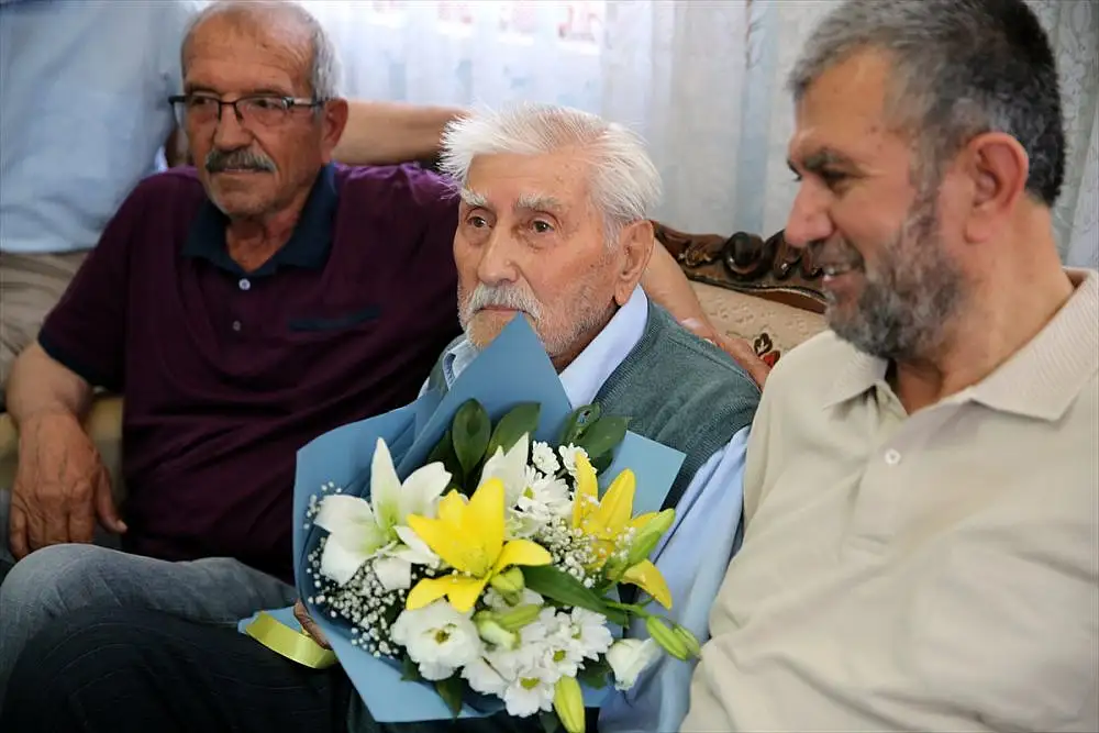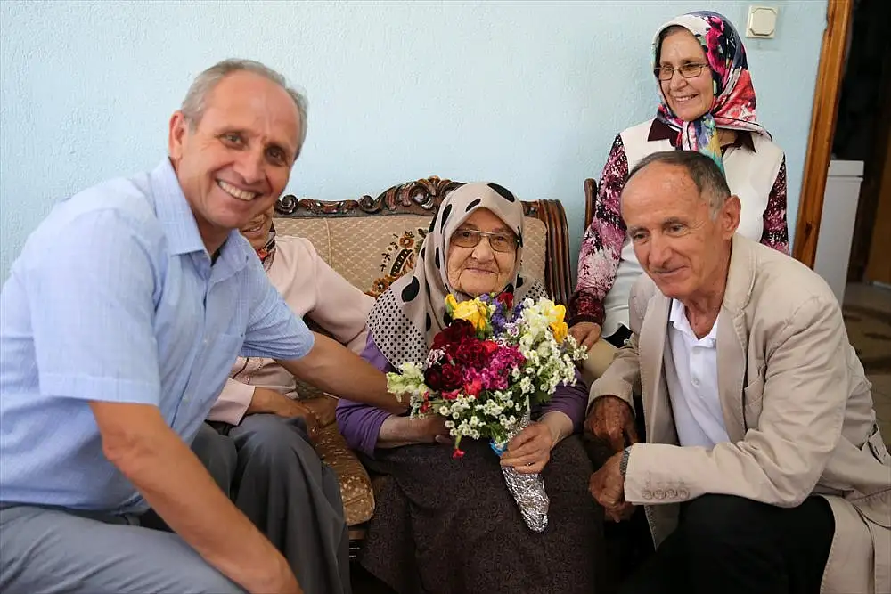 Öğrencilerinden 9 kişilik grup, Babalar Günü ve Kurban Bayramı dolayısıyla evinde ziyaret ettikleri Ülvan'ın 100. yaşını kestikleri pastayla kutladı.