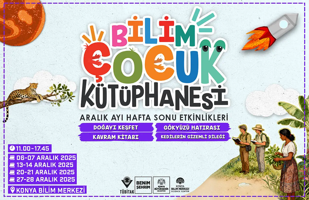 Konya Bilim Merkezi, Aralık ayı boyunca hafta sonlarını çocuklar için hem eğitici hem de keyifli etkinliklerle renklendiriyor. “Bilim Çocuk Kütüphanesi” çatısı altında düzenlenen atölyeler, minik ziyaretçilere doğayı keşfetme, uzayı tanıma, kavram geliştirme ve yaratıcılıklarını ortaya çıkarma fırsatı sunuyor. Etkinlikler 06–28 Aralık 2025 tarihleri arasında her hafta sonu saat
