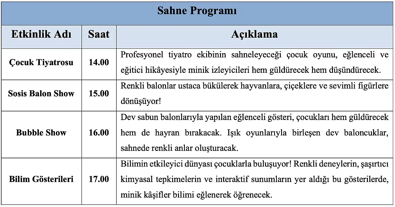 23 Nisan Ulusal Egemenlik ve Çocuk Bayramı’nı, Konya Bilim Merkezi’nde bilimle, sanatla ve eğlenceyle dolu etkinliklerle kutlanacak. Çocukların hayal gücünü geliştirecek, öğrenirken eğlenecekleri bu özel şenlikte, her yaştan çocuğa hitap eden dopdolu bir program sizleri bekliyor. Çocuk Şenliği'nde, geleceğin bilim insanlarını ve teknoloji ustalarını bir araya getirerek onların yeteneklerini keşfetmelerine ve ilham almalarına olanak tanıyacak, herkesin merakını uyandıracak bilim atölyeleri, etkinlikler ve gösteriler yer alacak. Bu özel gün, çocukların merak duygularını destekleyerek onları bilim ve keşif tutkusunda teşvik edecek bir platform sunacak. Bilimin büyülü dünyasına adım atarak keşifler, deneyler, bilim gösterileri ve atölye çalışmaları, yarışmalar ve birbirinden güzel etkinlikler gerçekleştirilecek.