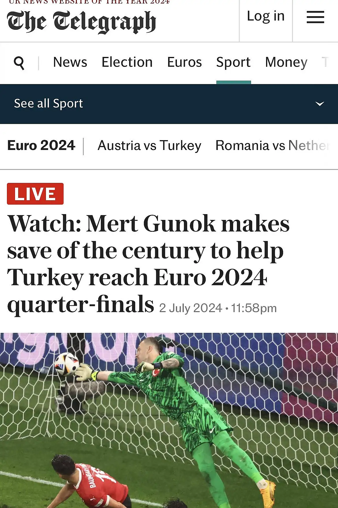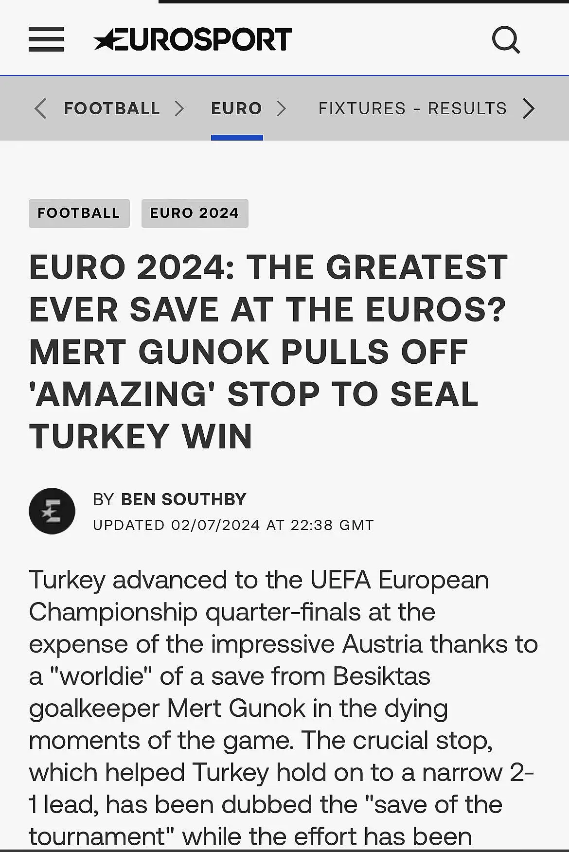 A Milli Takım kalecisi Mert Günok, dün oynanan Avusturya - Türkiye maçında yaptığı kurtarışlarla maça adeta damga vurdu.Dakikalar 90+4'ü gösterirken Prass'ın ortasında Baumgartner'in kafa vuruşunu yakın mesafeden çıkartan Mert Günok adeta çeyrek finale ta