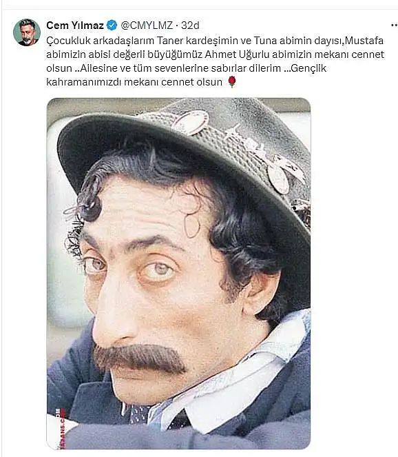 "Çocukluk arkadaşlarım Taner kardeşimin ve Tuna abimin dayısı, Mustafa abimizin abisi değerli büyüğümüz Ahmet Uğurlu abimizin mekanı cennet olsun. Ailesine ve tüm sevenlerine sabırlar dilerim. Gençlik kahramanımızdı mekanı cennet olsun"