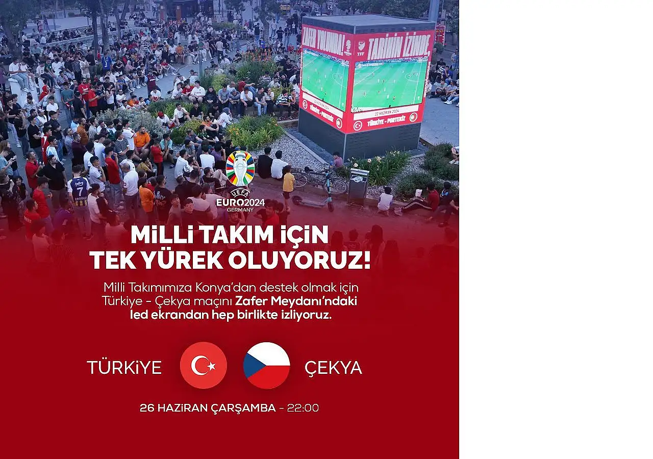 26 Haziran Çarşamba günü gerçekleşecek olan Türkiye- Çekya maçı öncesinde Konya Büyükşehir Belediyesi sosyal medya hesabından yaptığı paylaşımla Konyalıları Zafer Meydanı'na davet etti.Türkiye- Gürcistan karşılaşmasında olduğu gibi bugün akşam saat 22.