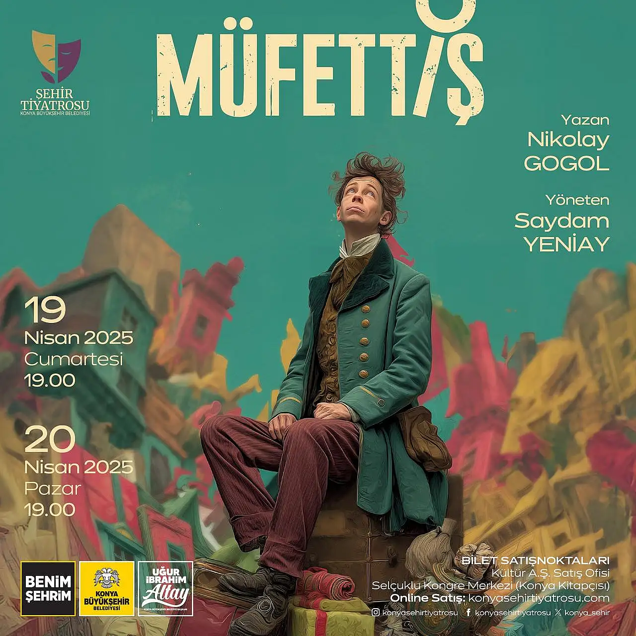 Konya Şehir Tiyatrosunda, Klasik Rus edebiyatının önemli yapıtlarından biri olan 'Müfettiş' adlı tiyatro oyunu prömiyer yaparak tiyatroseverlerle buluşuyor.Yazarı Nikolay Gogol, Yönetmeni Saydam Yeniay olan Müfettiş oyunu 19 Nisan Cumartesi saat 19.