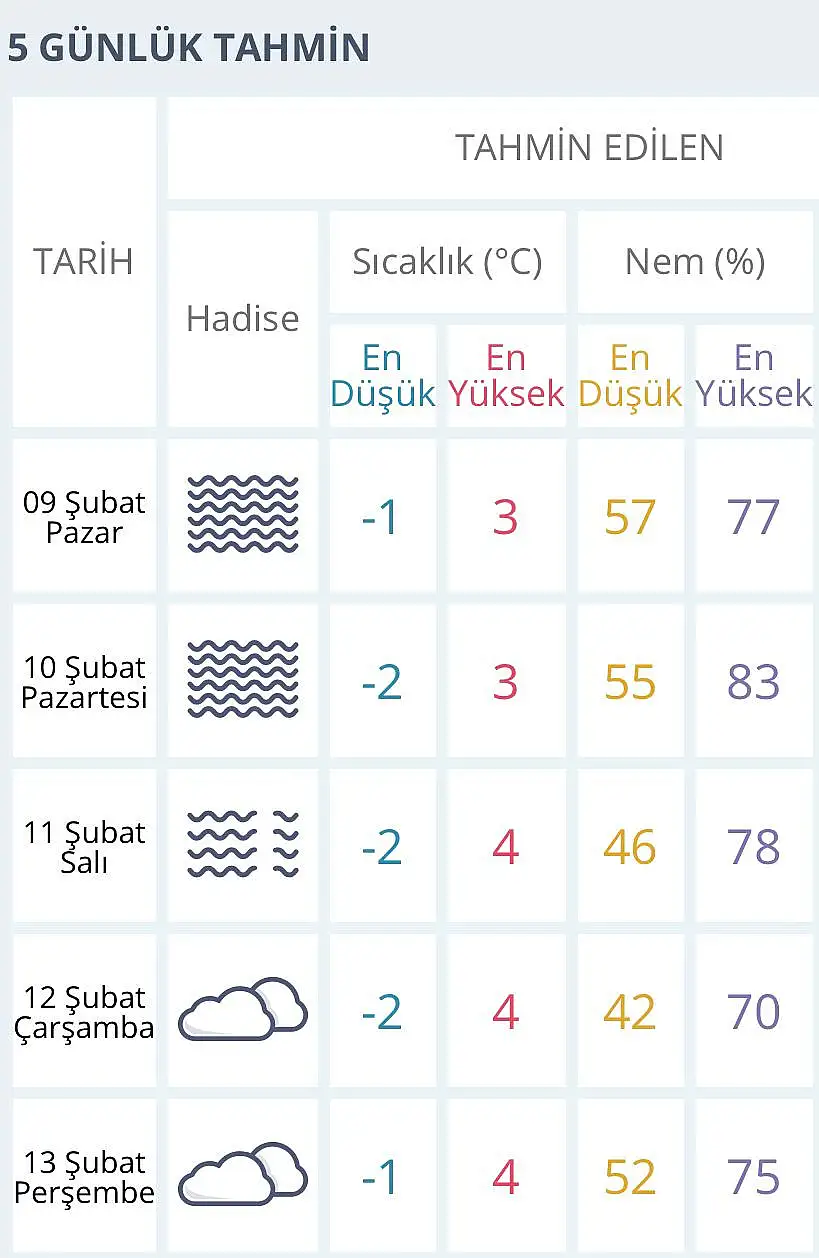MGM’nin tahmin raporuna göre 5 günlük hava tahmininde sıcaklıklar günden güne düşecek. Yapılan uyarılara göre; Konya’da 9 Şubat Pazar günü havanın en yüksek 3 derece en düşük -1 ve sisli olacağı belirtildi.