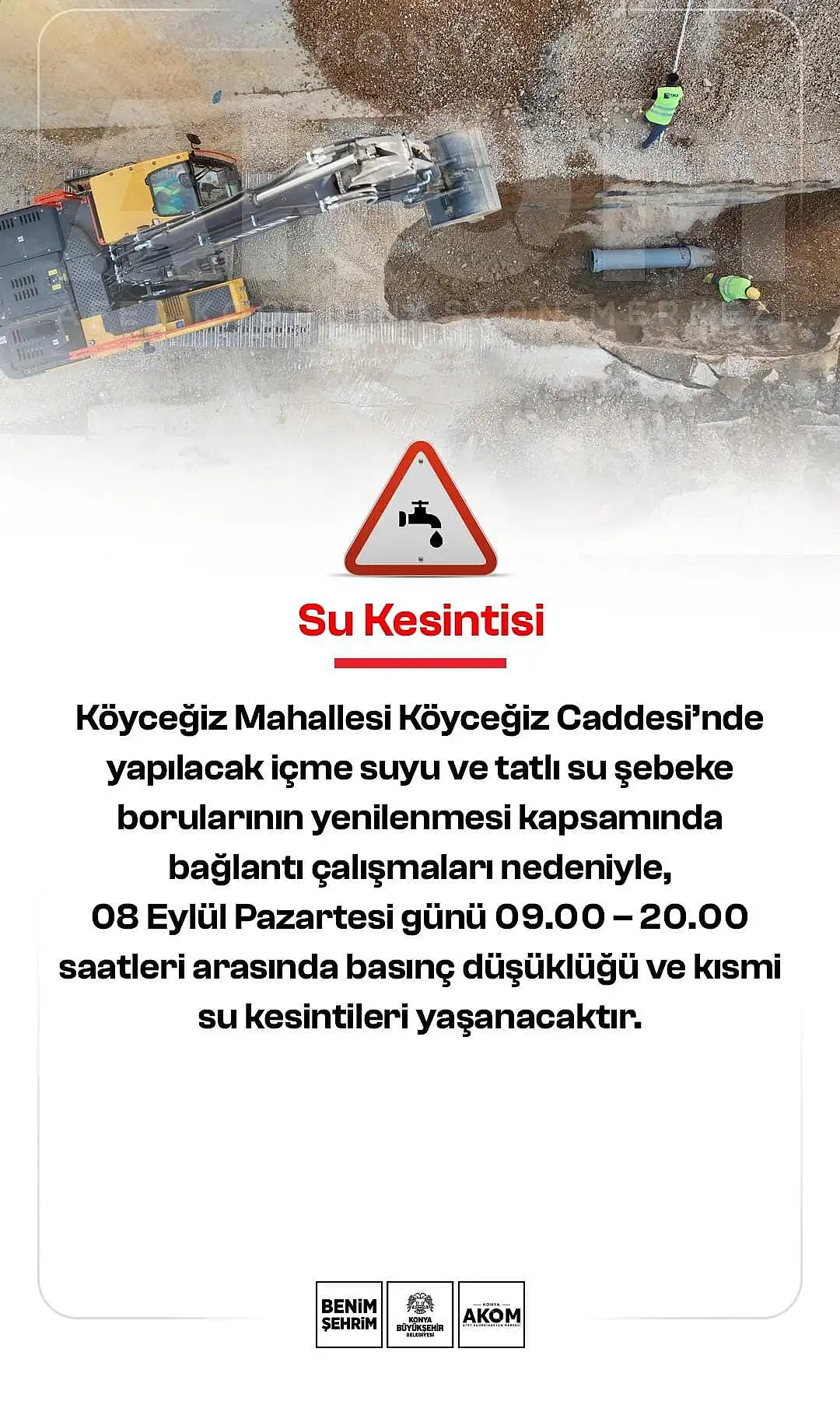 Konya'da Köyceğiz Mahallesi ve çevresinde içme suyu ile tatlı su şebeke hatlarının yenilenmesi çalışmaları kapsamında 8 Eylül Pazartesi günü belirli saatler arasında su kesintisi uygulanacak.Saat 09.