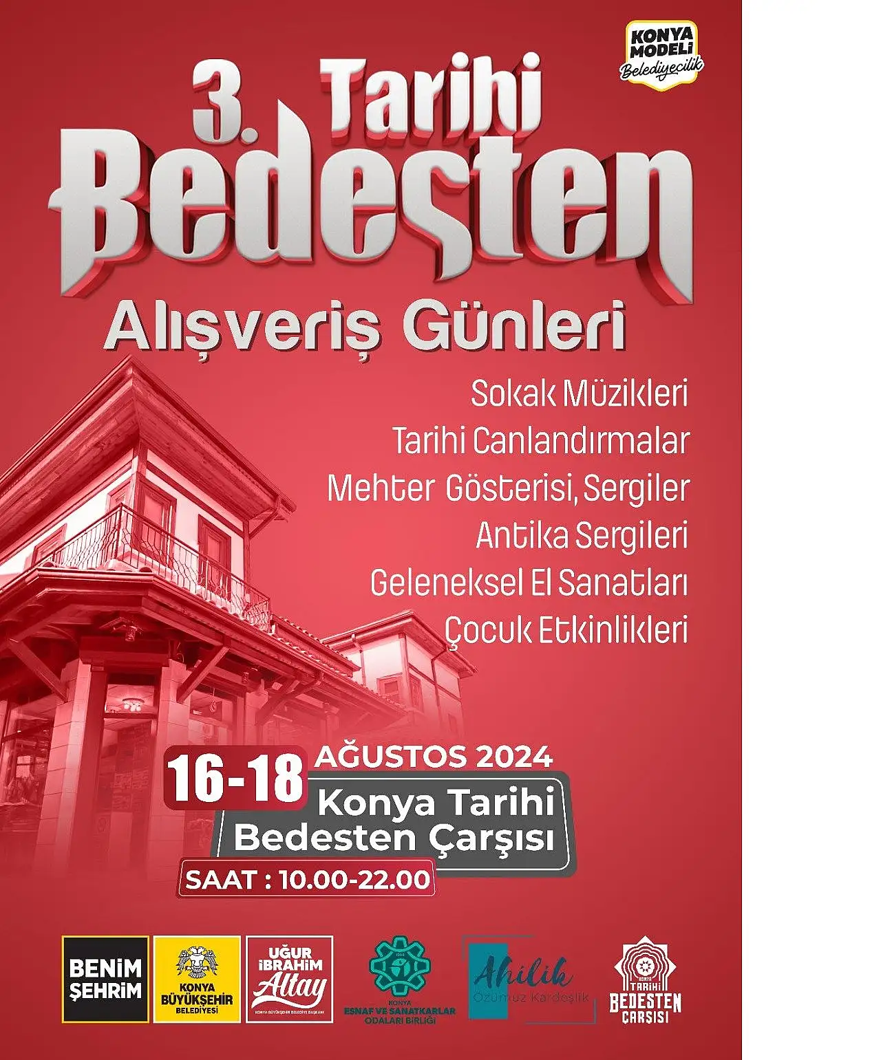 Türkiye Selçuklu Devleti'ne baş şehirlik yapan Konya'da, Romalılardan Selçuklulara, Osmanlı'dan günümüze binlerce yıllık geçmişe sahip Bedesten Çarşısında 3. kez Tarihi Bedesten Alışveriş Günleri yapılacak. Alışveriş Günleri kapsamında kortej yürüyüşü, temsili kıyafetler ile tarihi canlandırmalar, Mehteran Topluluğu konserleri, sokak sanatçılarının icra edeceği konserler, antika ürünlerin yer aldığı stantlar ve çocuk etkinliği planlanıyor. Tarihi Bedesten Çarşısı’nın alışveriş günlerine uygun alan süslemelerinin yapılmasının yanı sıra program süresince workshop çalışmaları yapılacak. (Karakalem, Çini, Testi, Cam Üfleme, Ebru Sanatı, Tezhip, Deri İşleme Sanatı, Kaligrafi vs.)