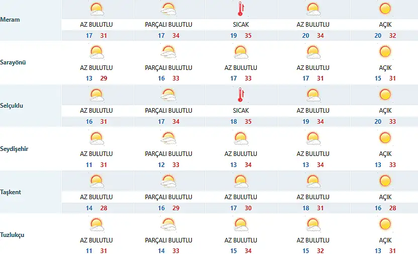 31 Ağustos Pazar günü için meteoroloji özellikle Konya merkez ile Karatay, Selçuklu, Kulu ve çevresindeki ilçeler için “sıcak hava uyarısı” yaptı. Bu tarihte termometrelerin Konya merkezde 35, Karatay ve Kulu’da ise 36-37 dereceye kadar çıkacağı ifade edildi.