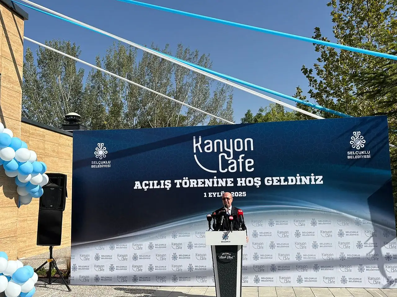 Bir yeme-içme mekânının, bir çay-kahve mekânının olmasının bu bölgeye hizmet edilmesi gerektiğini söylüyorlardı. Bu istekler ve talepler doğrultusunda Kanyon Kafemizin projesini hayata geçirdik. Kanyon Kafemiz 586 metrekare alana sahip ve aynı anda 300 misafirimizi ağırlayabileceğimiz büyüklükte. Hem yeme-içme alanlarıyla hem de oturma alanlarıyla çok leziz ve kaliteli hizmet verecek bir bina oldu, bir tesis oldu. İnşallah hemşehrilerimiz bu tesisimizden en güzel şekilde yararlanacaklar. Tesisimizde farklı bir uygulamayı da hayata geçiriyoruz. Sabah başlayıp saat 13.00'e kadar burada açık büfe kahvaltı sunulacak, 13.00'ten sonra da normal kafe hizmetleri devam edecek. Yine hemşehrilerimizin istek ve beklentisi doğrultusunda bu hizmeti hayata geçiriyoruz. Açık büfe servisimizle birlikte hemşehrilerimiz burada rahat bir şekilde ve uygun fiyatlı olarak kahvaltılarını yapabilecekler, misafirlerini ağırlayabilecekler. Farklı organizasyonlar için kalabalık grupların da buradan hizmet alabileceği mekânlarımız mevcut. Hem kapalı alanımızla hem açık alanımızla Selçuklumuzda en güzel, en kaliteli hizmeti sunacak mekanlardan birisi olacak" şeklinde konuştu.