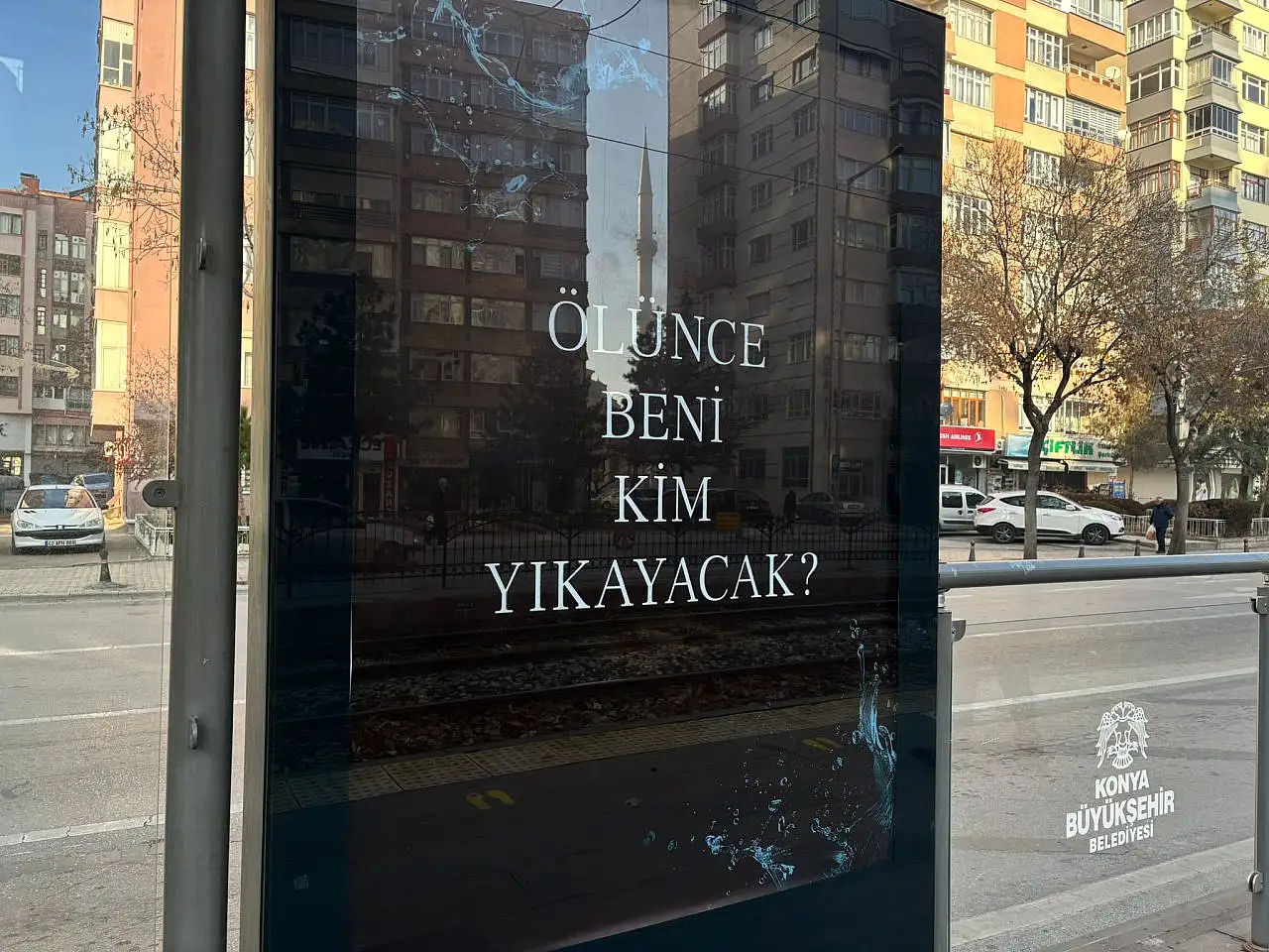 Konya'da tramvay durakları, otobüs durakları ve şehrin en işlek caddelerine asılan billboardlar dikkat çekti. Billboarda yazan yazı merak uyandırdı. Şehrin birçok yerinde açık hava ilanlarında siyah zemin üzerine "Ölünce Beni Kim Yıkayacak?" yazısını görenler sosyal medya platformları üzerinden araştırmaya başladılar. Peki bu yazının sebebi ne?