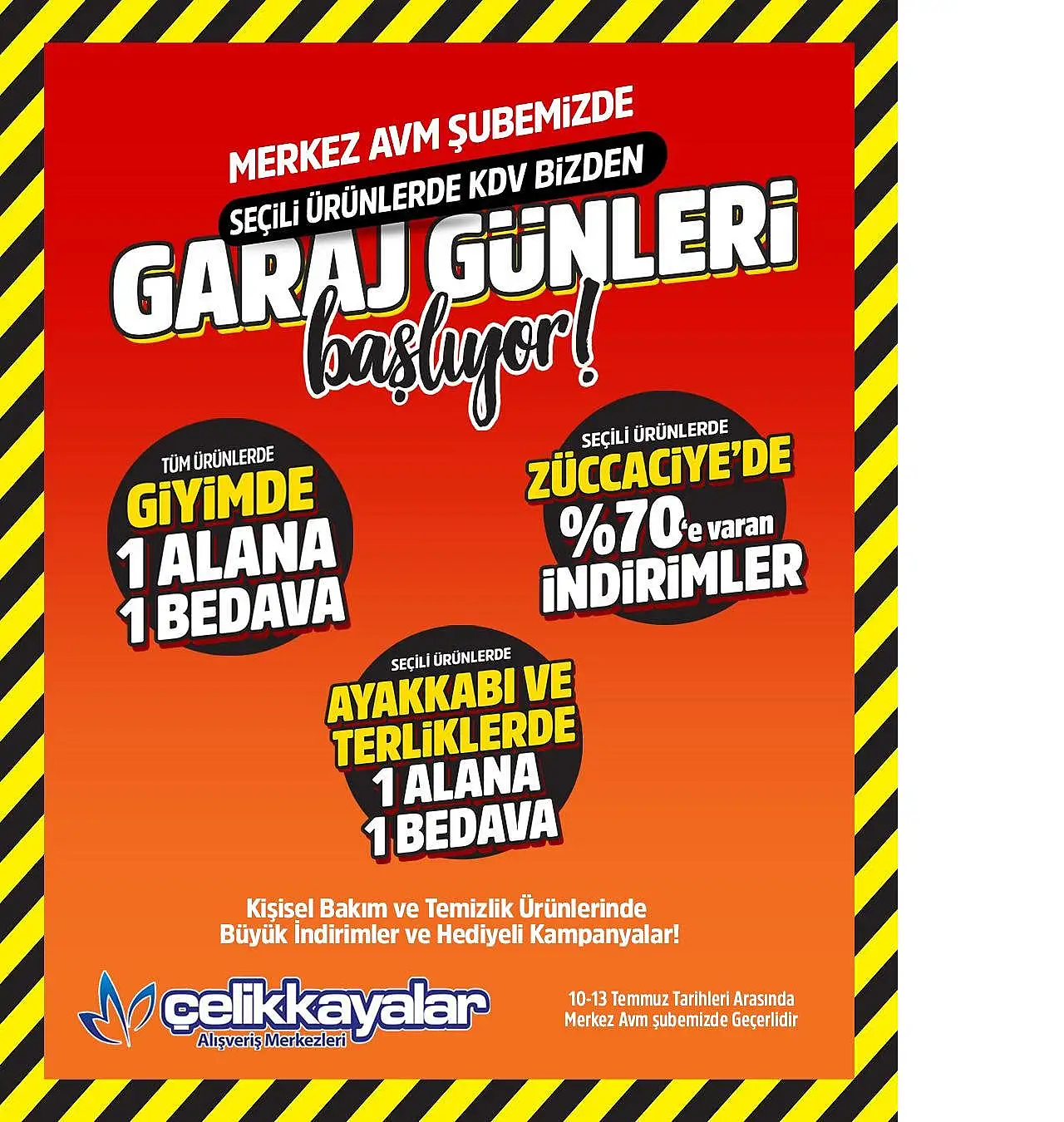 Çelikkayalar Merkez AVM'de Garaj Günleri kapsamında birçok fırsat sizi bekliyor. Etiket fiyatı üzerinden tüm giyim ürünlerinde bir alana bir bedava kampanyası ile gardıroplar yenileniyor. Evini güzelleştirmek isteyenler için züccaciye ürünlerinde %70'e varan indirimler sizleri bekliyor. Seçili ayakkabı ve terliklerde bir alana bir bedava fırsatıyla ayaklar şenleniyor. Evinizin ve kendinizin ihtiyaçlarını karşılamak için temizlik ve kişisel bakım ürünlerinde bir alana bir bedava kampanyasından yararlanın. Üstelik seçili ürünlerde KDV bizden! Alışverişlerinizi daha da keyifli hale getirecek, hediyeli ve promosyonlu ürünler de Garaj Günleri'ne özel indirimlerle sunulacak.