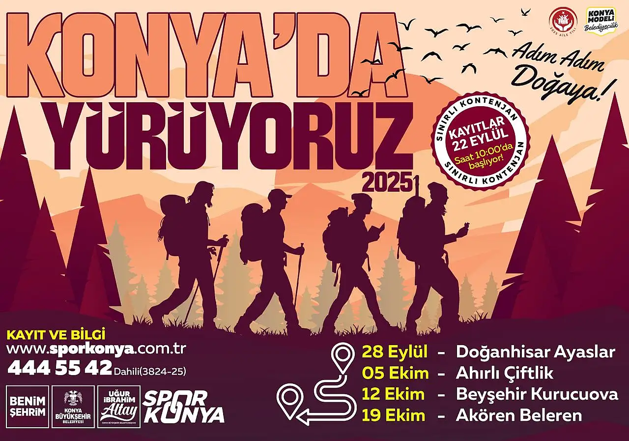 "Konya'da Yürüyoruz" teması kapsamında doğa yürüyüşleri bu sefer 4 farklı ilçede gerçekleşecek. 28 Eylülde başlayan doğa yürüyüşleri 19 Ekim tarihine kadar devam edecek. Yürüyüşler sırasıyla 28 Eylül'de Doğanhisar Ayaslar, 5 Ekim'de Ahırlı Çiftlik, 12 Ekim'de Beyşehir Kurucuova ve 19 Ekim'de Akören Beleren'e yürüyüş gerçekleşecek.